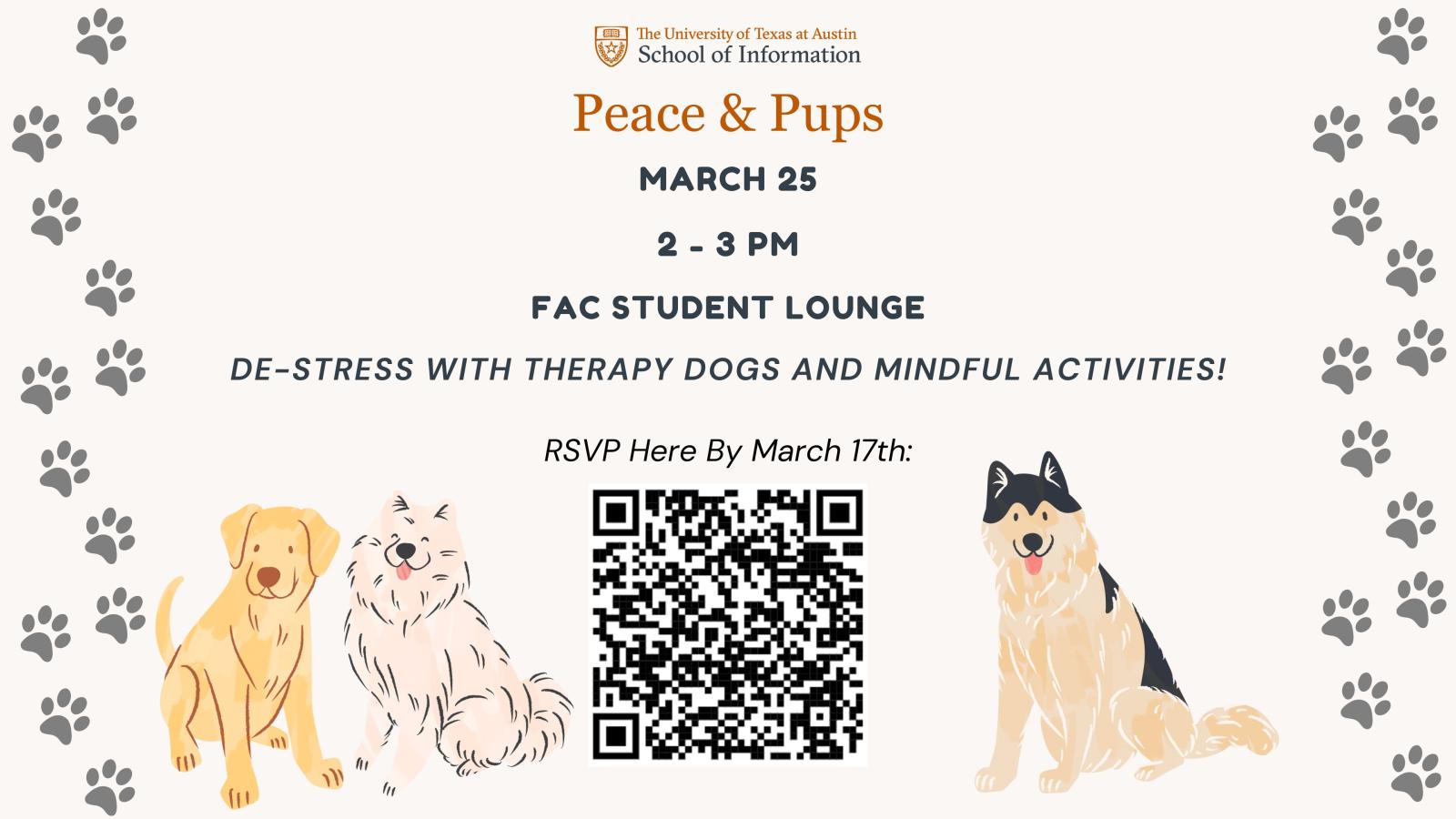 Event Status Scheduled De-stress with therapy dogs and mindful activities! Undergraduate & graduate iSchool students are welcome to attend.RSVP Event Details Date and Time March 25, 2025, 2 to 3 p.m. Location Student Lounge (FAC 18N)